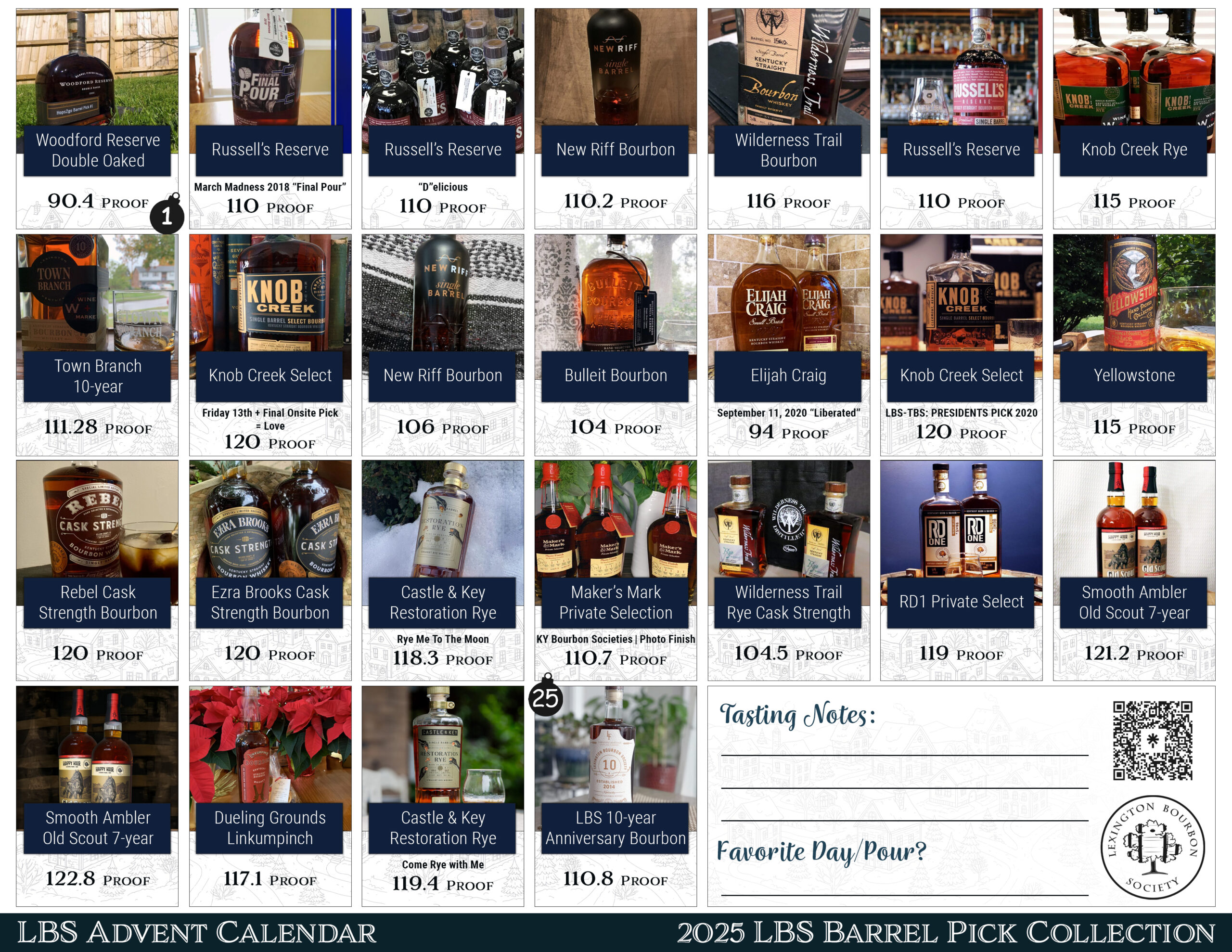 Our first calendar focuses on LBS barrel picks we have collected over the years. Since 2018, our society has been able to share various barrel picks with our friends, families, and the local community. We are excited to share these bottles with our participants for the 2025 advent season!
